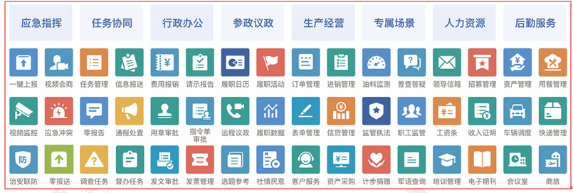 重点应用:移动门户、学习中心、会务、考勤、会议室预定、车辆调度、工作圈、电子签约、通知公告、审批、任务管理、每日报告、访客管理、调查问卷。